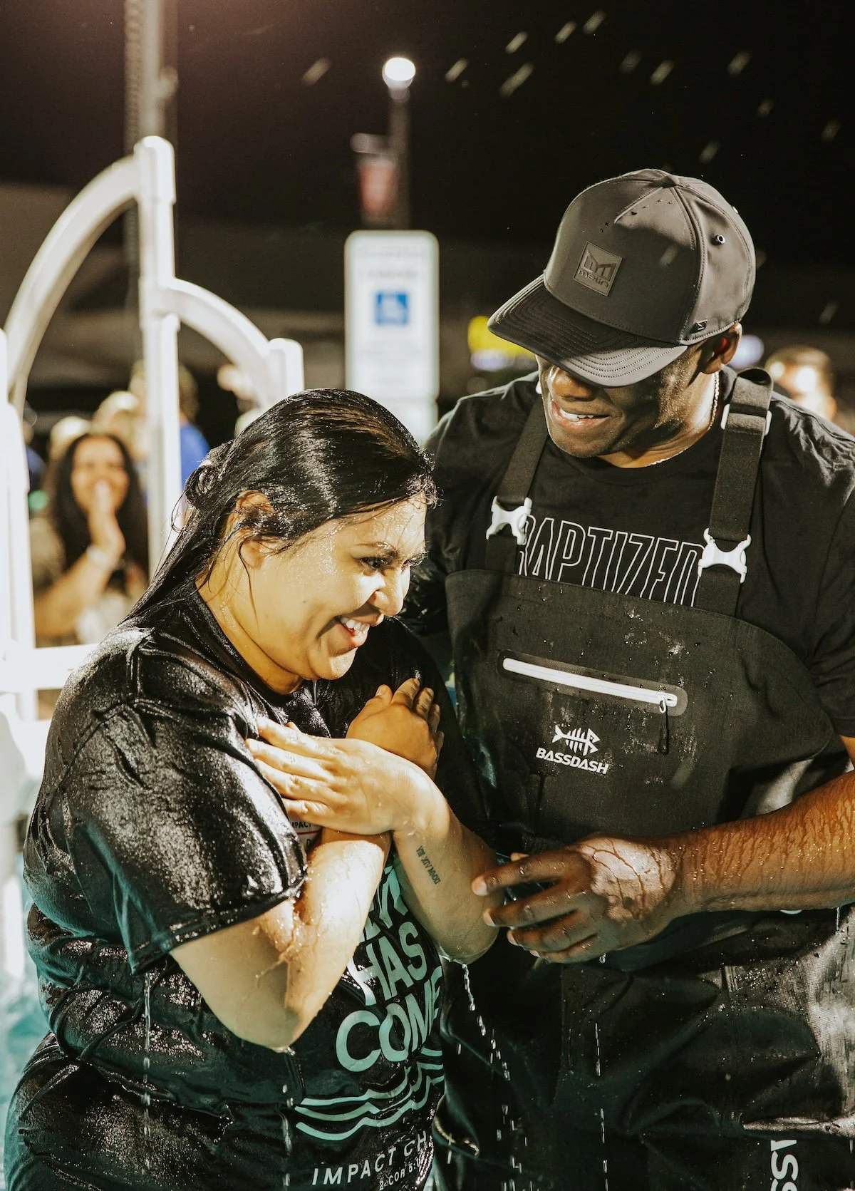 Please arrive in the clothing you intend to be baptized in (wear dark workout pants/shorts). We’ll provide you with an Impact Baptism t-shirt after you check-in. Facilities are provided for you to change out of your wet clothing. We recommend you wear flip flops to walk from the baptismal to the changing area. Bring your dry clothing and towel with you.